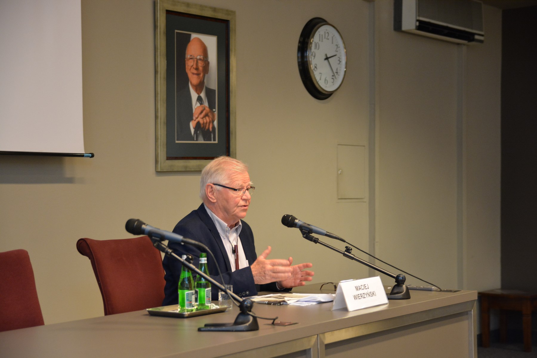 Maciej Wierzyński siedzi przy stole prezydialnym i prowadzi wykład.